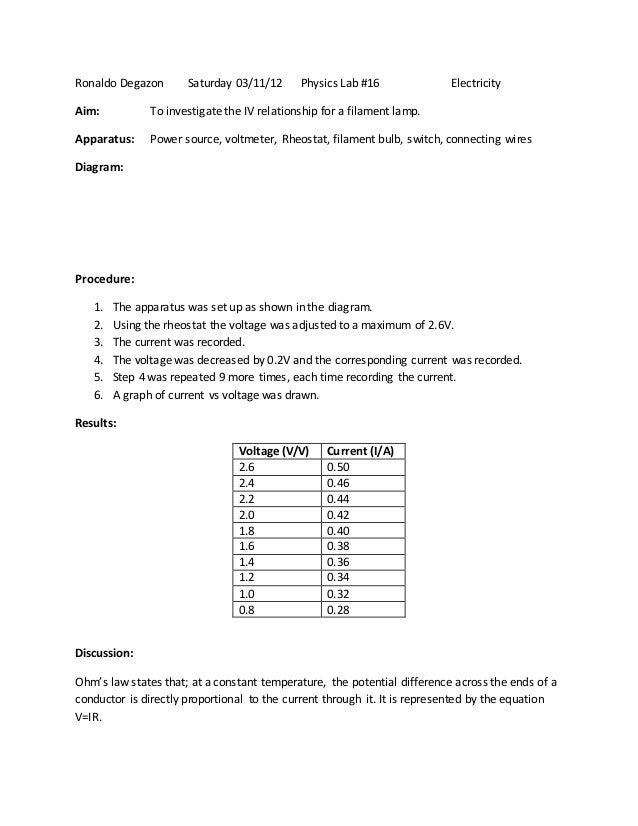 - Laboratory investigation into the resistance of a filament bulb essay 06